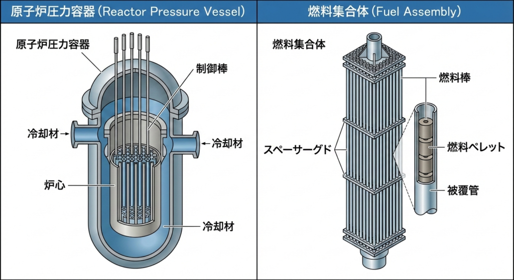 図1:原子炉圧力容器(左)と燃料集合体(右)の模式図。